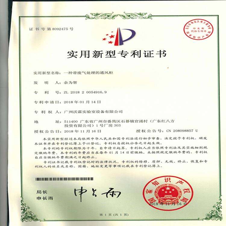專利證書——帶廢氣處理通風(fēng)柜