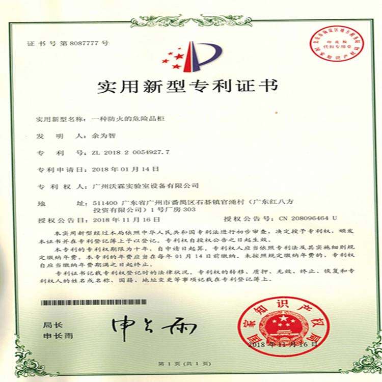 專利證書——防火的危險品柜