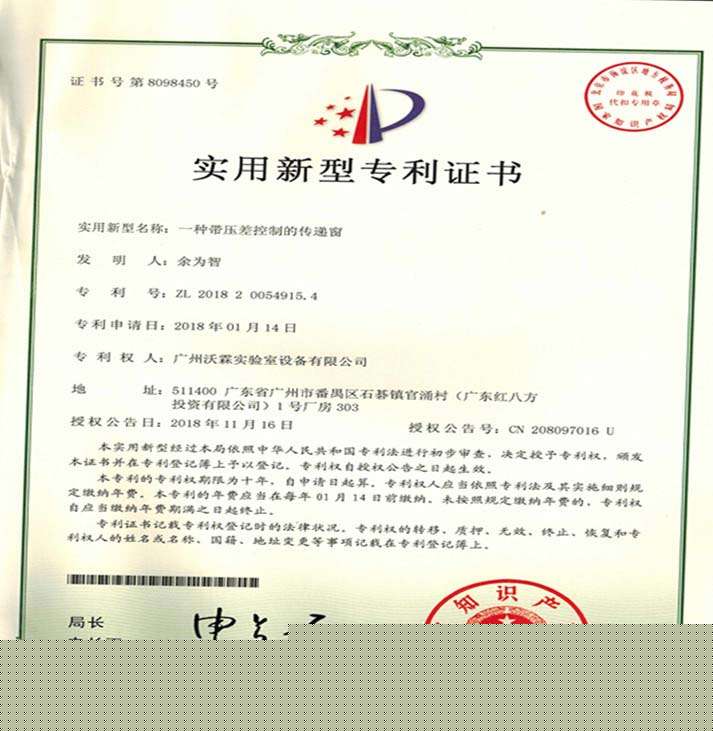 專利證書——帶壓差控制傳遞窗